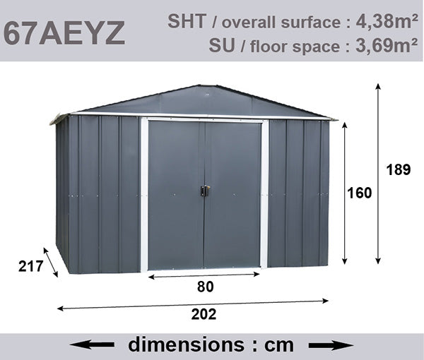 Sastavljanje ove vrtne kućice ne zahtijeva nikakve posebne vještine ili alate. Planirana površina mora biti vodoravna i tvrda te preporučujemo izradu betonske ploče kako biste olakšali rutinsko održavanje i učvršćivanje vašeg skloništa. Dvije osobe ga mogu sastaviti u jednom danu sa zajedničkim alatima (libela, odvijač, ključevi ili nasadni ključevi, ljestve itd.). Sastavljanje se mora obaviti na otvorenom terenu kako bi se izbjeglo oštećenje različitih elemenata. Neki dijelovi imaju jaku otpornost na vjetar; sastavljanjem po vedrom vremenu izbjegava se svaki rizik. Nakon sastavljanja, vaše spremište mora biti ispravno usidreno na tlo pomoću priloženog kompleta.